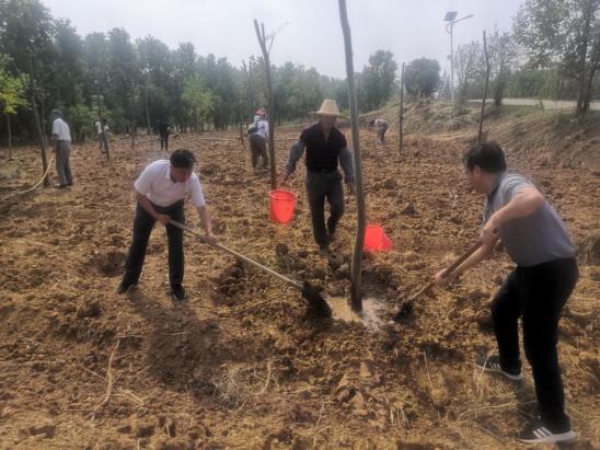 其后,大家來到公司位于浮山村苗圃的幫扶林,領(lǐng)導和公司黨員們一起,兩人一組將從農(nóng)戶新采購的苗木種植到位。大家有的扶樹正苗,有的揮鍬培土,有的踩土定植,配合十分默契,不一會苗圃基地再添一抹新綠。