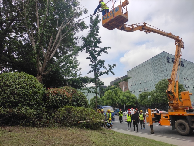 與此同時,另一條指令隨即傳出,“河西大街樹木枯枝斷枝,存在極大安全隱患,立刻到場處置”。公司立即調配3輛園林搶險車輛、1輛高架車,20名搶險隊員第一時間趕到現(xiàn)場。指揮勘查險情、實施圍擋、引導交通、處理險枝,大家分工明確、操作熟練,搶險過程一氣呵成。20分鐘后,這株干徑超過40厘米、高10米的大樹上的枯枝已全部修剪到位,解除了安全隱患。