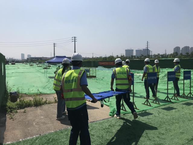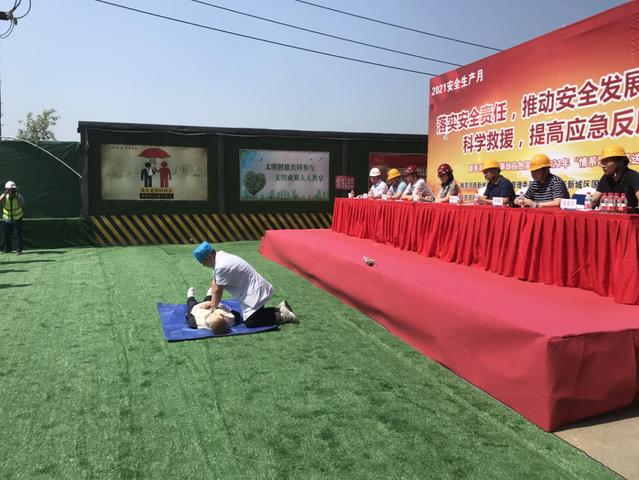本次應(yīng)急救援演練由河西集團(tuán)新城公司承辦。模擬事故發(fā)生后,班組負(fù)責(zé)人向項(xiàng)目安全部匯報(bào)。項(xiàng)目經(jīng)理立即聯(lián)系附近雙閘街道衛(wèi)生院請(qǐng)求醫(yī)護(hù)救援,組織應(yīng)急救援工作,向監(jiān)理及甲方主要領(lǐng)導(dǎo)報(bào)告事故發(fā)生情況。隨后,有關(guān)人員及隊(duì)伍按照現(xiàn)場(chǎng)救援指揮部的指示及《高溫中暑應(yīng)急救援預(yù)案》的要求開展救援及善后工作。