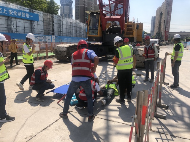 本次應急演練活動模擬施工現(xiàn)場履帶式起重機在作業(yè)過程中由于鋼絲繩斷裂,吊物從高處掉落倒下,不幸將地面一名作業(yè)人員腳部砸傷的事故?,F(xiàn)場專職安全員發(fā)現(xiàn)后第一時間向應急救援指揮部匯報,應急救援指揮部立即啟動應急預案,各應急救援小組接到救援命令后,迅速跑向事故地點,對受傷人員開展救援工作,同時拉起警戒線,保護現(xiàn)場。救援人員按預案分工,有條不紊地實施清障、包扎、傷員擔架固定、運送上救護車等一系列動作。本次演練活動,增強了員工的安全操作意識,提高了快速反應能力、應急救援能力以及協(xié)同作戰(zhàn)能力。