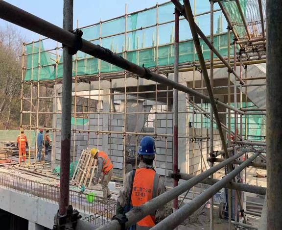在紫金山莊配套設(shè)施擴(kuò)改建項(xiàng)目現(xiàn)場(chǎng),聽(tīng)到的是機(jī)器轟鳴、車(chē)輛喧囂的聲音,看到的是工作忙碌、干勁十足的景象,工人們正加緊二次結(jié)構(gòu)的施工。