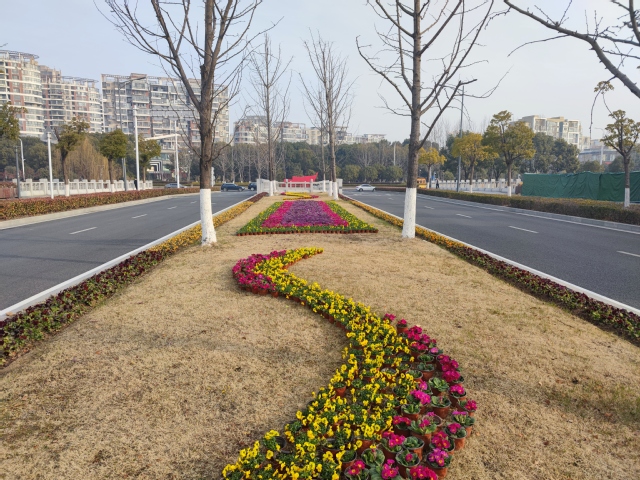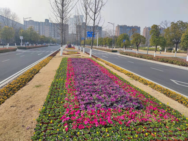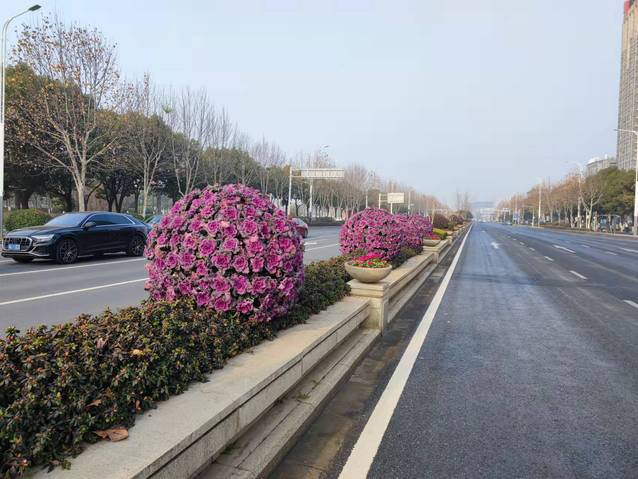 江蘇大劇院水韻路中分帶的花球也換上了“新裝”。10個(gè)巨大的羽衣甘藍(lán)花球被粉色的報(bào)春花和紅黃顏色角堇組成的花帶簇?fù)碇?/span>與兩邊的直線橙色花邊、方形花卉矩陣、流線型花帶一起構(gòu)成了一幅色彩斑斕、氣勢(shì)恢宏的絢麗畫卷,不但為兩會(huì)烘托出莊嚴(yán)隆重的氛圍,也洋溢著春節(jié)喜慶的氣氛。