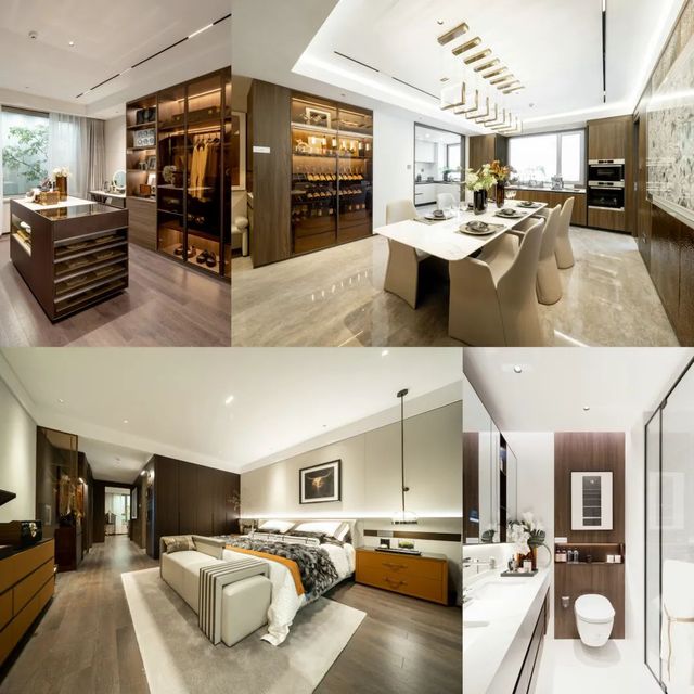 此次公開的樣板間為265㎡奢華四房兩廳三衛(wèi)雙陽臺戶型,在戶型研發(fā)和飾面材料使用上,設計團隊都針對主要客戶人群的需求,經過反復斟酌,對細節(jié)處理更是精益求精,成為奧體公司迭新之作。硬朗的石材紋理與沉穩(wěn)的木飾面碰撞出豐富的層次變化,加上墻面局部銅制捶打紋飾面和內嵌式金屬開關面板,營造低調奢華的現(xiàn)代風格。