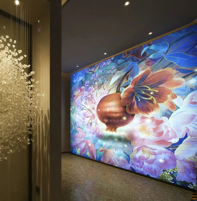 “人間歡喜事,石榴成熟時”,藝術生活館中一幅瑰麗絢爛的手繪花神圖渲染出主題氛圍,鮮花簇擁顆粒飽滿石榴的畫幅,姹紫嫣紅中,將奧體公司開發(fā)的奧體新城各小區(qū)名稱中的植物元素有機組合在一起,觀眾置身其中,仿佛能聞到花的芳香、看到石榴籽的晶瑩剔透。畫面寓意著花開興隆、興旺昌盛,祝福幸福美好生活紅紅火火,也體現(xiàn)了河西集團“開發(fā)幸福、運營美好”的經營理念。整幅花神圖由特邀手繪師親繪而成,十分珍貴。